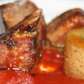 Atún con patata confitada y mermelada de pimientos