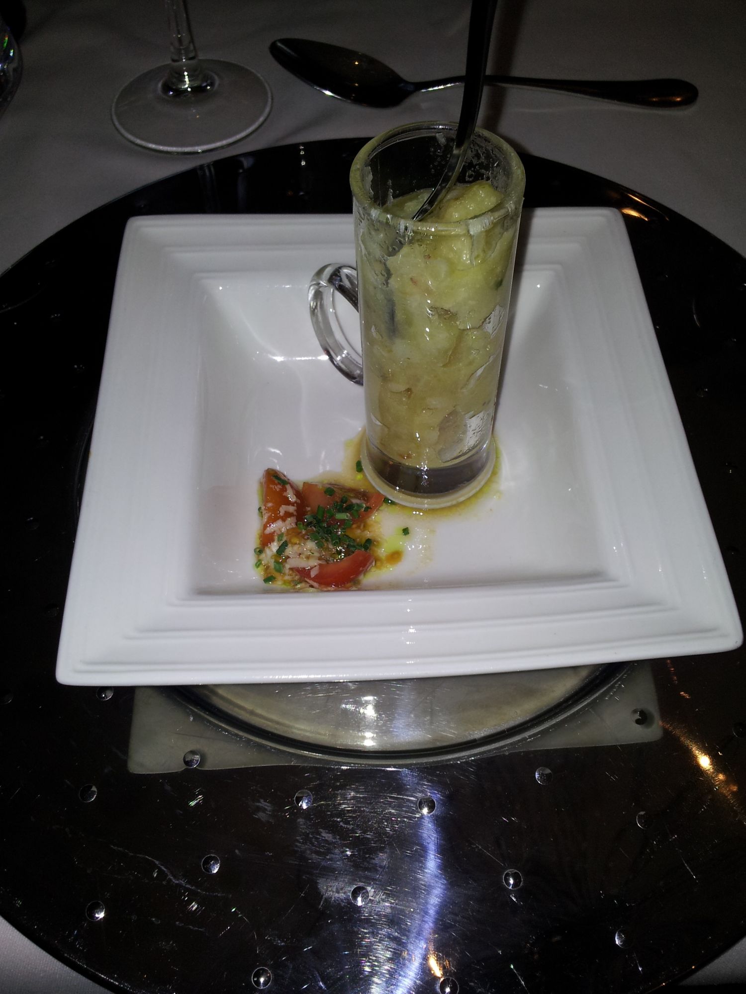 El chupito de Maridaje de manzana Hero debe emplatarse en un vasito, sea de la forma que sea. Éste a su vez, encima de un platito y puede ir acompañado de mini tomatitos a modo de presentación.