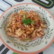 Y listo!! Ya tenemos un rico plato de pasta tricolor con una salsa de tomate con carne molida.
