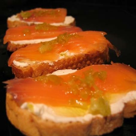 tosta de pan, untada de queso azul, loncha de salmon Noruego y cucharadita de mermelada maridaje, se decora con media nuez, es una delicia...