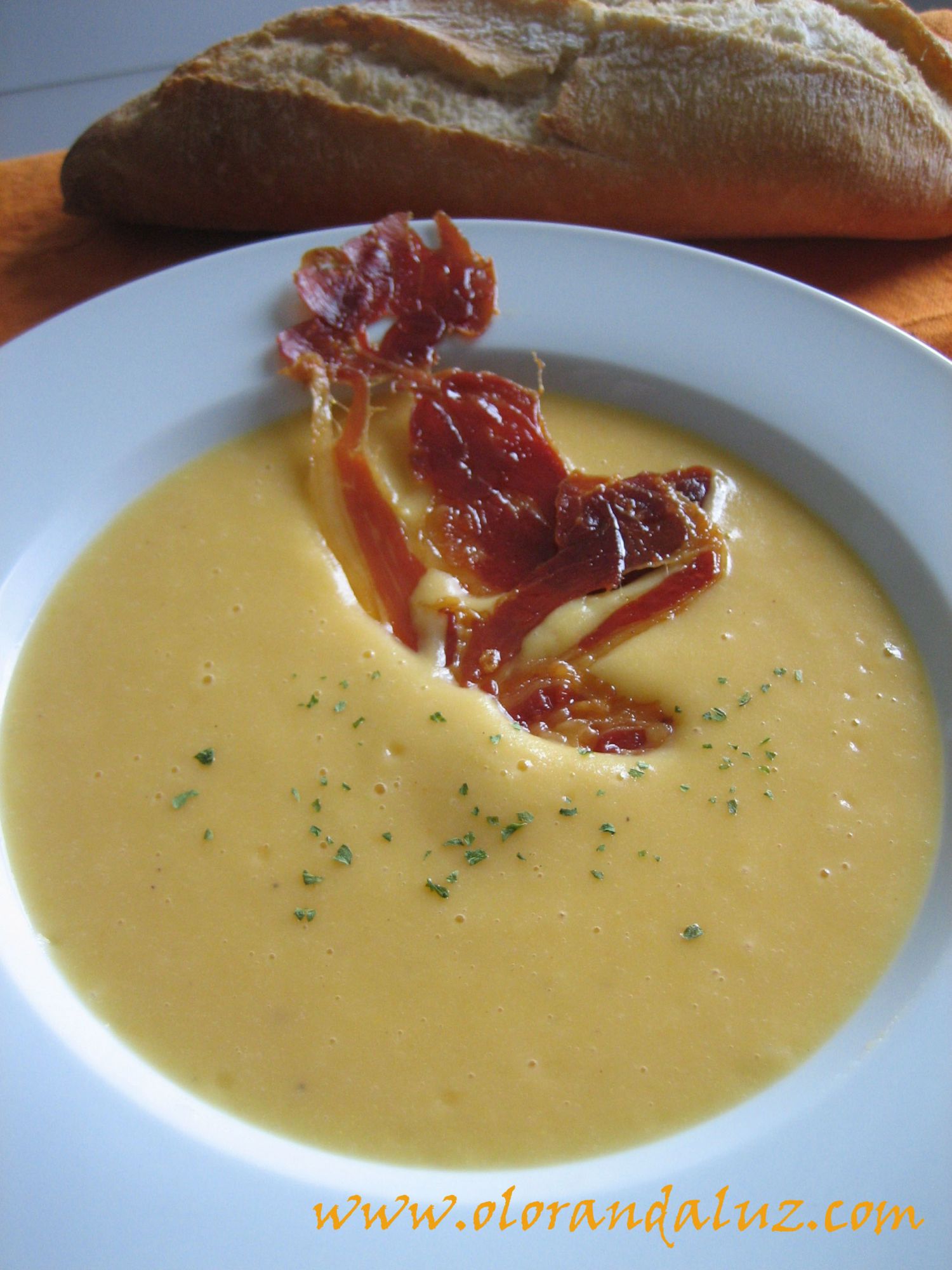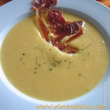 Para decorar, en nuestro caso hemos utilizado crujiente de jamón pero también se pueden añadir picatostes, cebolla y/o puerro frito, jamón picado, daditos de queso curado,...