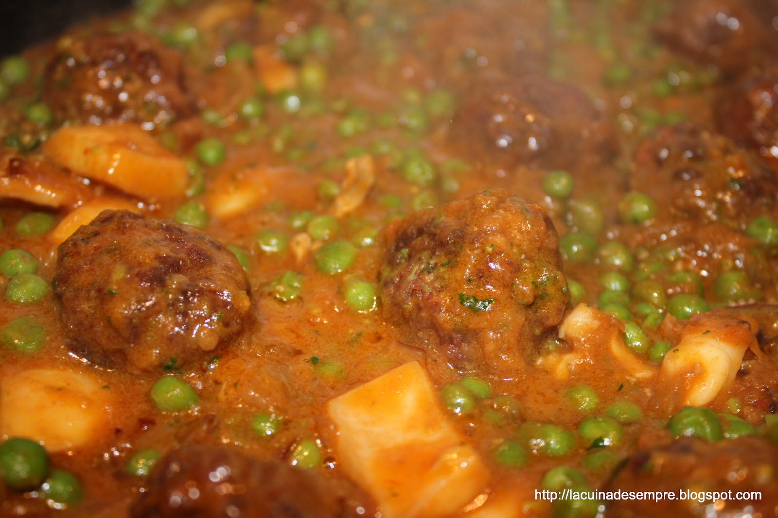 Quan la tomata està cuita cal afegir el vi. Deixar reduïr i després tirar aigua o caldo i les mandonguilles (fins que cobreixi). Rectificar de sal.