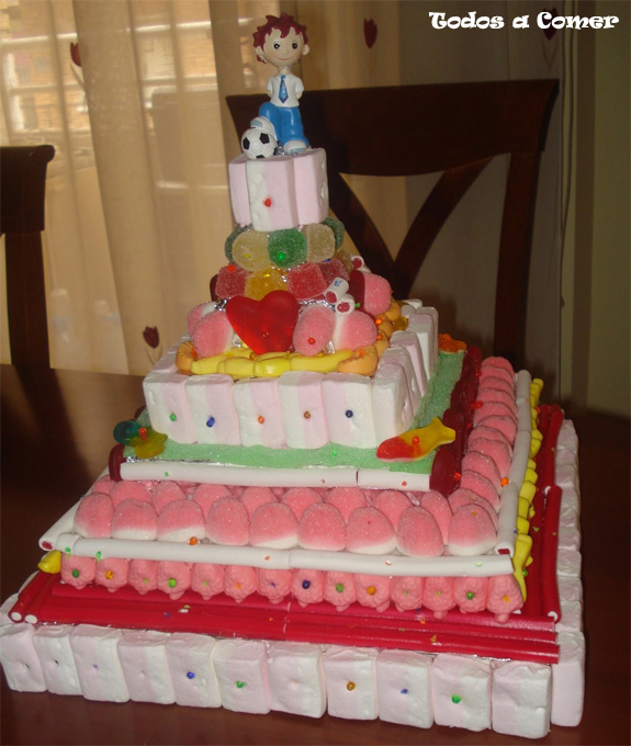 Es muy importante que no quede ningún hueco sin chuches para que no se vea el papel de aluminio. El último piso podemos decorarlo con algo especial como una vela de cumpleaños.