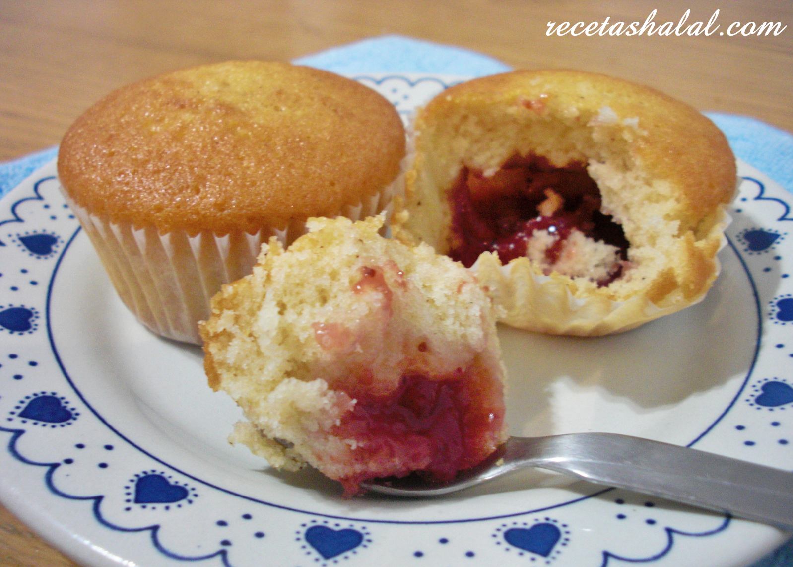 Ahora llenaremos los 10 moldes de magdalenas. Tenemos que recordar siempre que se llenan tres cuartas partes del molde solamente, ya que la magdalena sube bastante en el horno. Para rellenarlos pondremos primero una pequeña cantidad de masa. Encima, añadimos una cucharada de mermelada de fresa, y después cubrimos con más masa de magdalena.