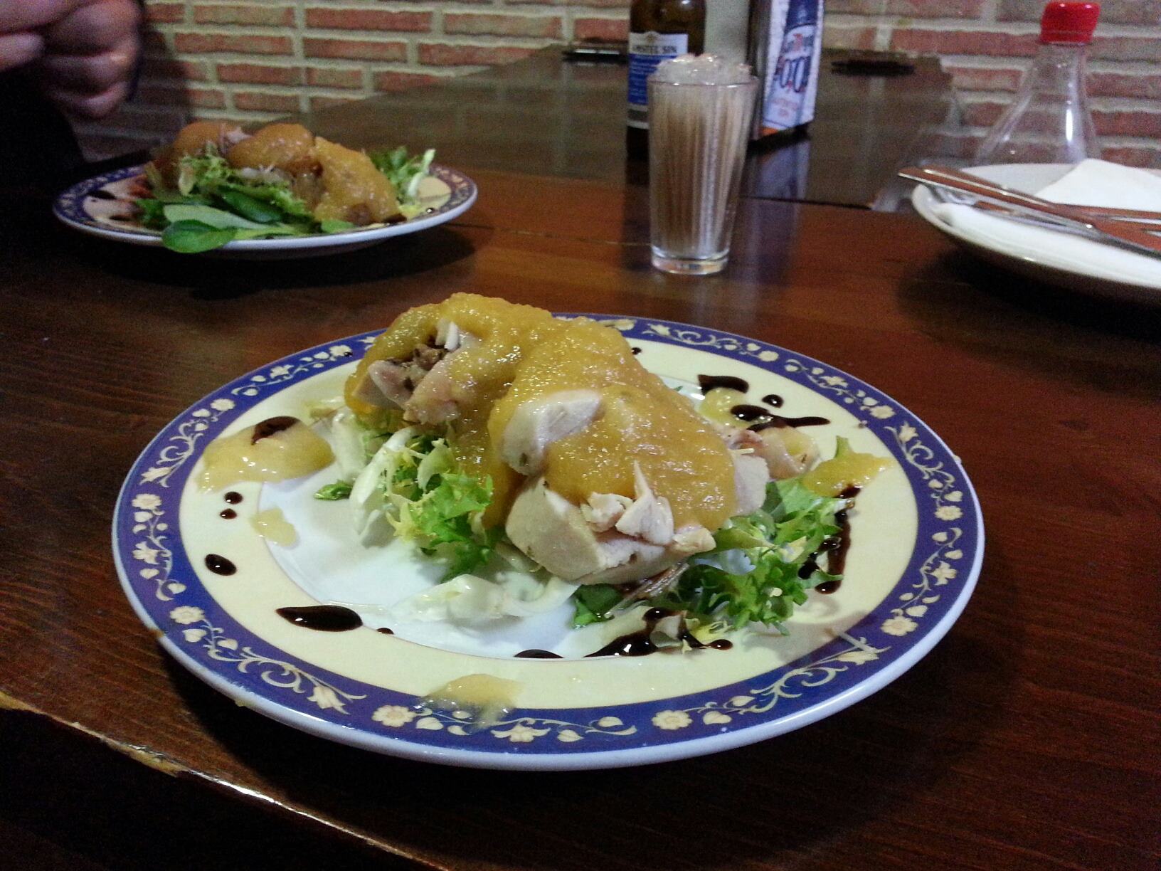 Emplatamso colocando el pollo y la cebolla y al lado la mermelada de manzana
