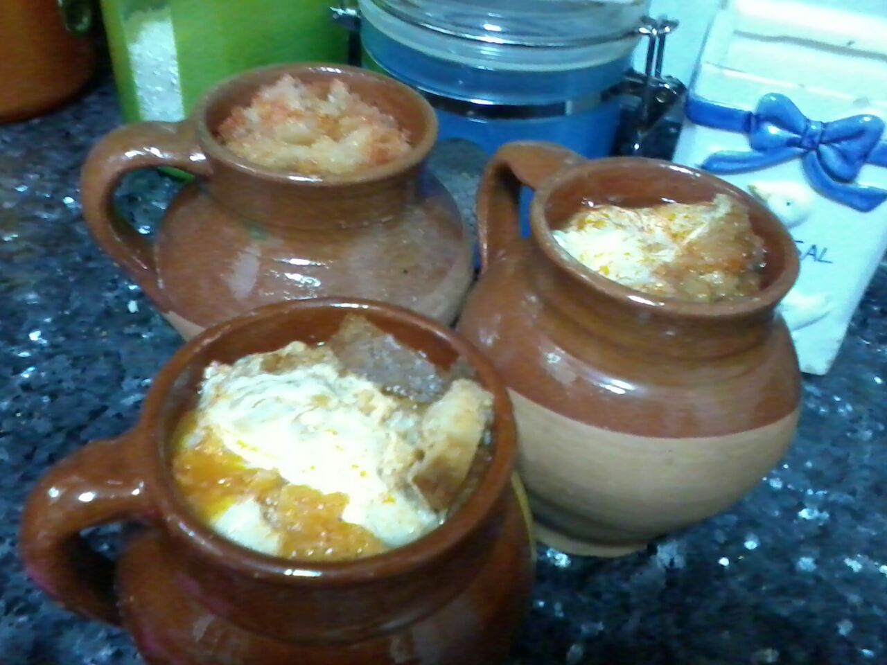 Si se quieren hacer con huevo: poner el huevo sobre el pan en las escudillas y añadir poco a poco el caldo hirviendo para que se cuaje el huevo.