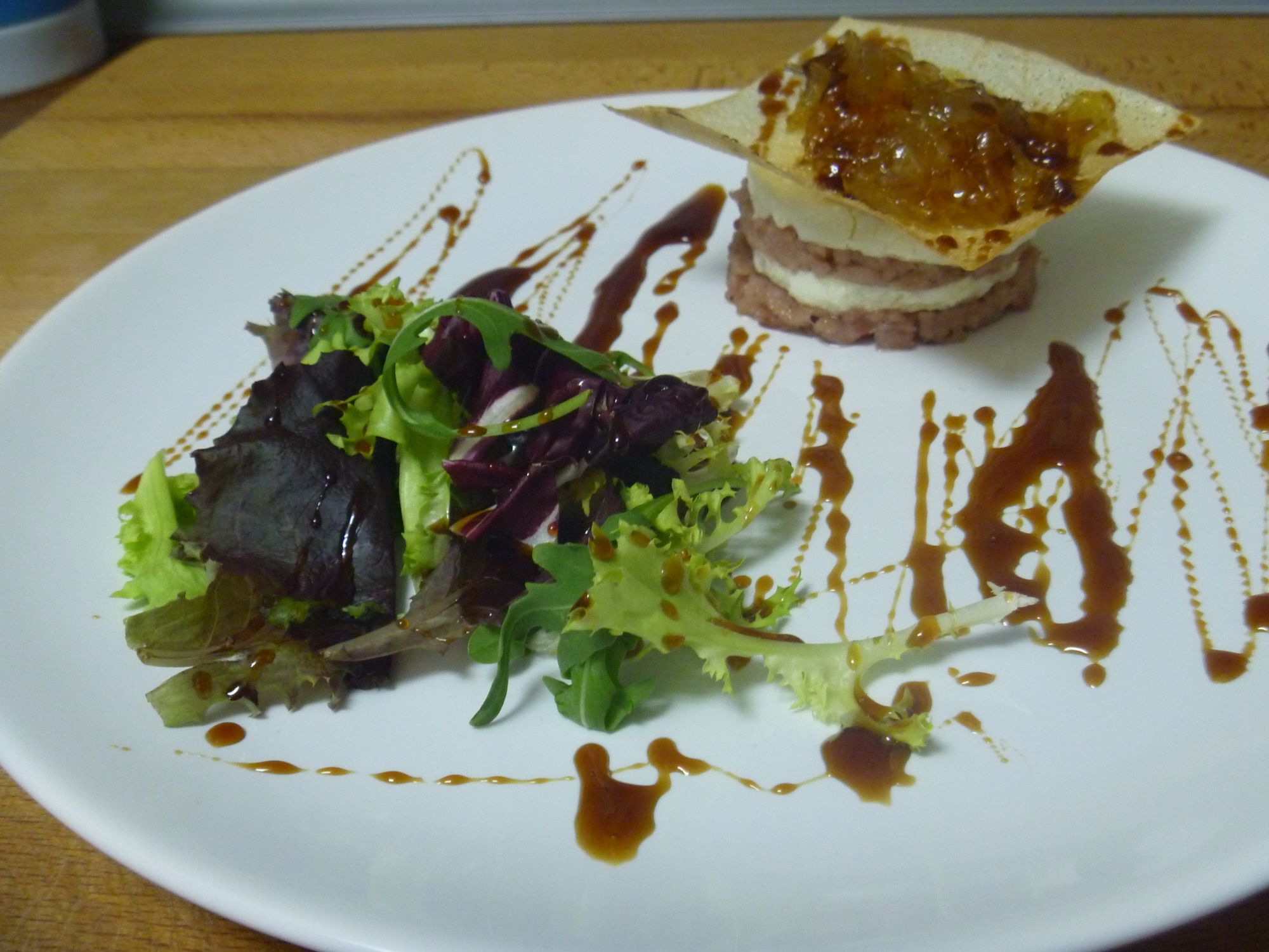 Tartaleta de butifarritas y rulo de cabra con dulce de cebolla.