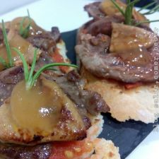 Rehogar las cebollas picadas junto con una pizca de aceite de oliva virgen y un poquito de agua. Una vez esten pochadas añadir el azucar y dejar que se ligue y reduzca, hasta que coja un tono dorado que aproximadamente sera unos 25-30 minutos. (Con resultado tenemos la opción de pasarlo por la turmix y dejarlo mas en textura de mermelada, pero eso va en el gusto de cada uno). Reservar.