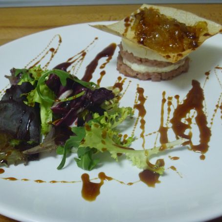 Cojemos una lámina de masa brick, que nos aportará un toque crujiente, y la metemos al horno, previamente calentado a 180°C y en aproximadamente en 1/2 minuto, cuando este empezando a estar más sólida, la sacamos y la ponemos encima de la tartaleta. A continuación y sobre esta colocamos el dulce de cebolla. Metemos la preparacion 2 minutos al horno para que el queso empieze a fundir, terminemos de dorar la masa brick y calentemos en general el plato. Acompañamos con unos brotes de mezcla de lechugas para darle frescor al plato y decoramos con la reduccion del Pedro Ximénez que nos dara un toque especial de sabor.
