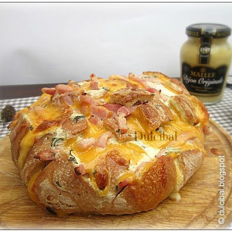 - Montar el plato: Hacer cortes horizontales y verticales en el pan sin llegar hasta abajo de manera que queden cuadraditos en la hogaza. Entre ellos regar con salsa barbacoa, colocar el queso a trocitos y repartir el bacon. Añadir más salsa. Normalmente, ahora se envuelve el pan en papel de aluminio y se hornea unos 15 minutos pero yo lo puse directamente a gratinar hasta que se doró el bacon y se gratinó el queso y en unos pocos minutos ya estaba listo!