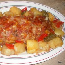 Poner en una bandeja de horno el lomo con las verduras y meter al horno a 180° aproximadamente media hora, a media cocción añadir el vino y dejar reducir un poco.