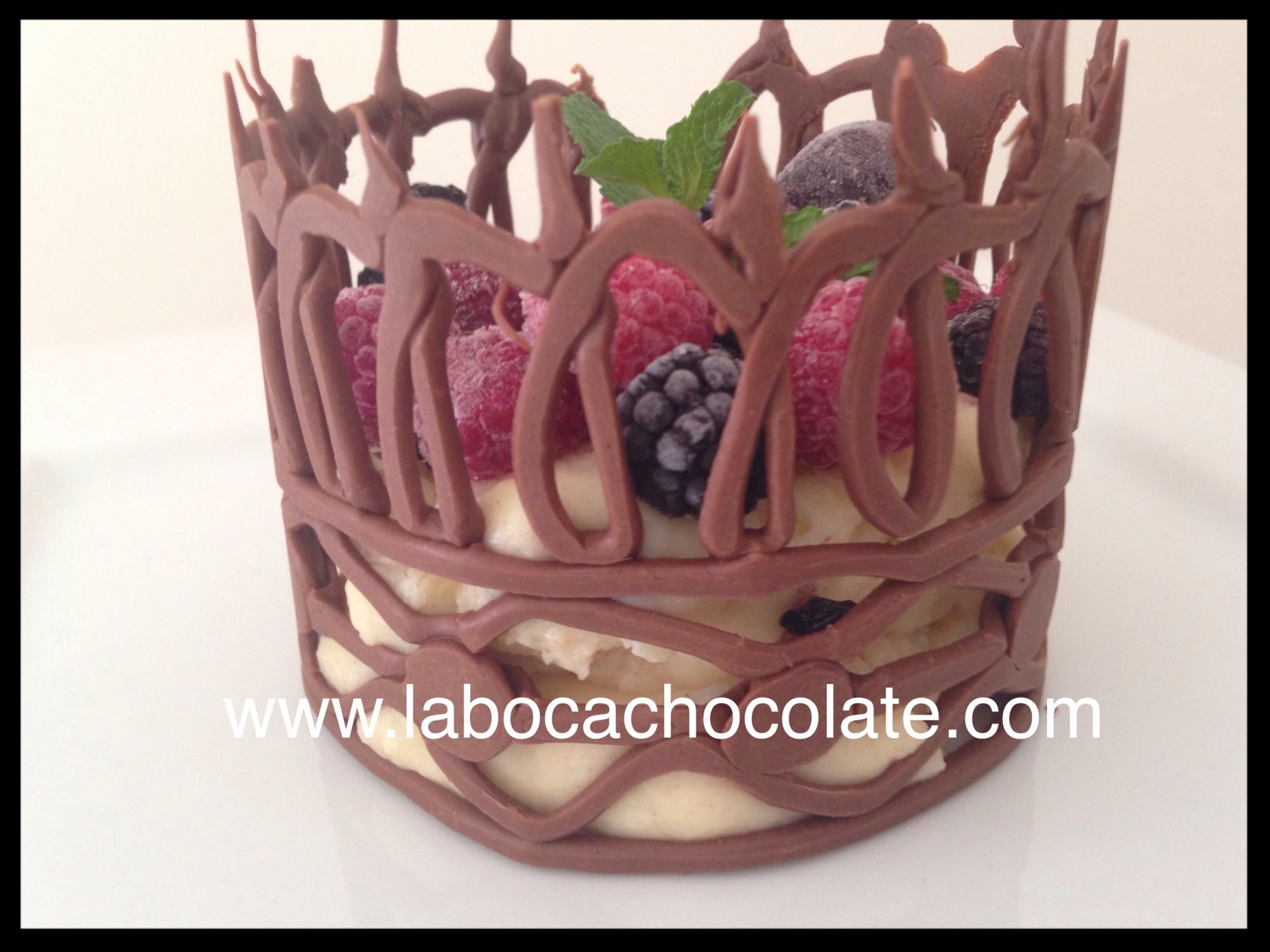Antes de empezar a temperar el chocolate y dibujar sobre papel de hornear deberéis preparar una tira de papel en donde dibujaréis 3 líneas para delimitar la parte en la que irá la crema (esta cenefa debe ser mas consistente y los agujeritos del dibujo mucho más compactos) y la otra cenefa (la aérea) en la cual crearéis vuestro diseño más imaginario y artístico (dejad libre la imaginación y a ver que sale...).