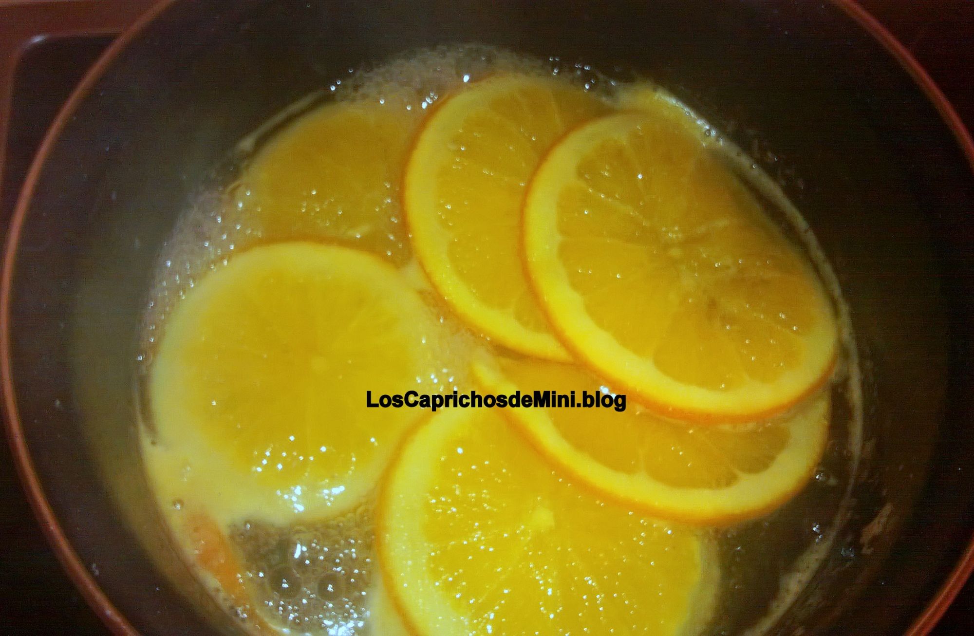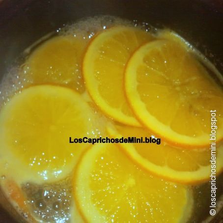 Poner el azúcar y el agua en una cacerola colocar dentro las rodajas de naranja cubiertas por el agua, cocer a fuego bajo hasta que casi desaparezca todo el almíbar.