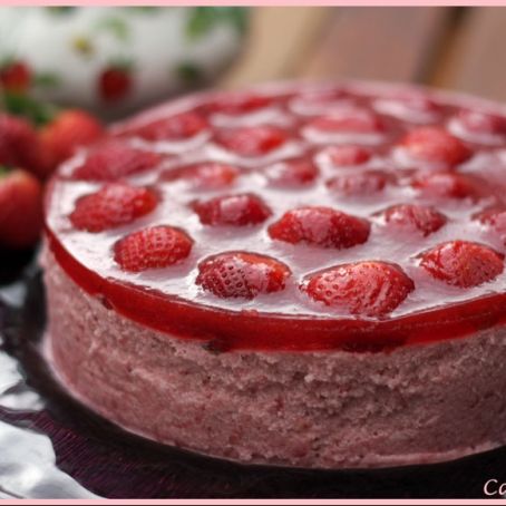 hidaratamos las hojas de gelatina, y ponemos las fresas con el azúcar a cocer hasta que estén tiernas,las trituramos , y añdimos las hojas de gelatina hasta que se disuelva,dejamos templar un poco y añadimos los yogures, ya un poco batidos, para que se mezclen bien, cuando esté templada se añade la nata con movimientos envolventes para que no se baje.