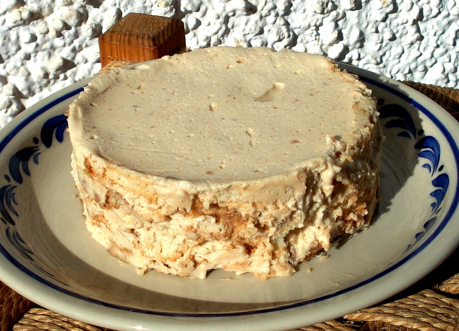 Cubrir la base del molde con galletas mojadas en café. Poner una capa de crema de turrón por encima de las galletas y seguir alternando capas de galleta (mojada en el café) y crema, terminando con una capa de crema.