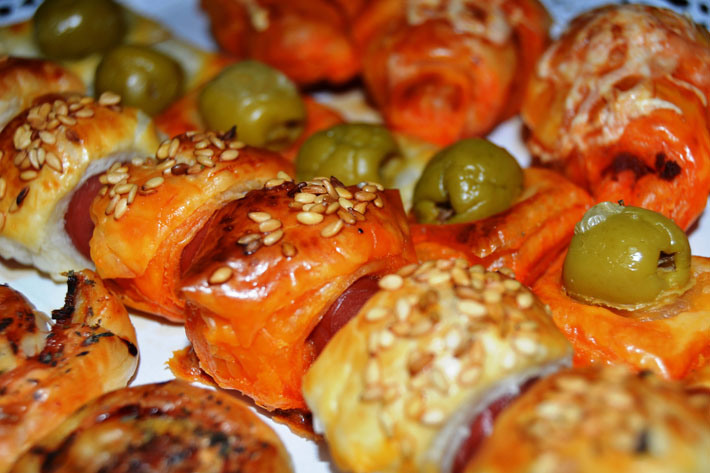 Diria que són les més senzilles de fer... Tallem la pasta de full en quadrats, els pintem amb ou i hi posem una oliva (una mica escapçada de sota perquè no rodoli) al damunt. Si volem, decorem amb julivert.