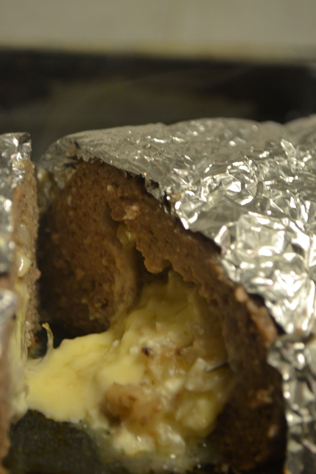 Rellenar con la panceta , los quesos, las aceitunas, los huevos duros, puñadito de nueces picada y enrollar como un pionono.