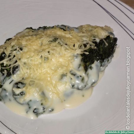 Preparamos la salsa bechamel (ver) y la volcamos encima de las espinacas.
