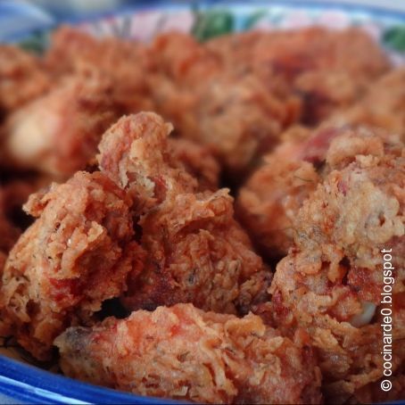 Una vez tengamos el pollo limpio, sin piel y troceado, lo ponemos en un bol al que añadiremos la mezcla de los huevos batidos con la leche (opcional se le puede añadir agua (la misma cantidad de leche y salpimentar con pimienta blanca y sal el pollo (si se hace esto luego no poner pimienta y cuidado con la sal))). Dejamos que la carne de nuestro pollo frito estilo americano macere al menos una hora.