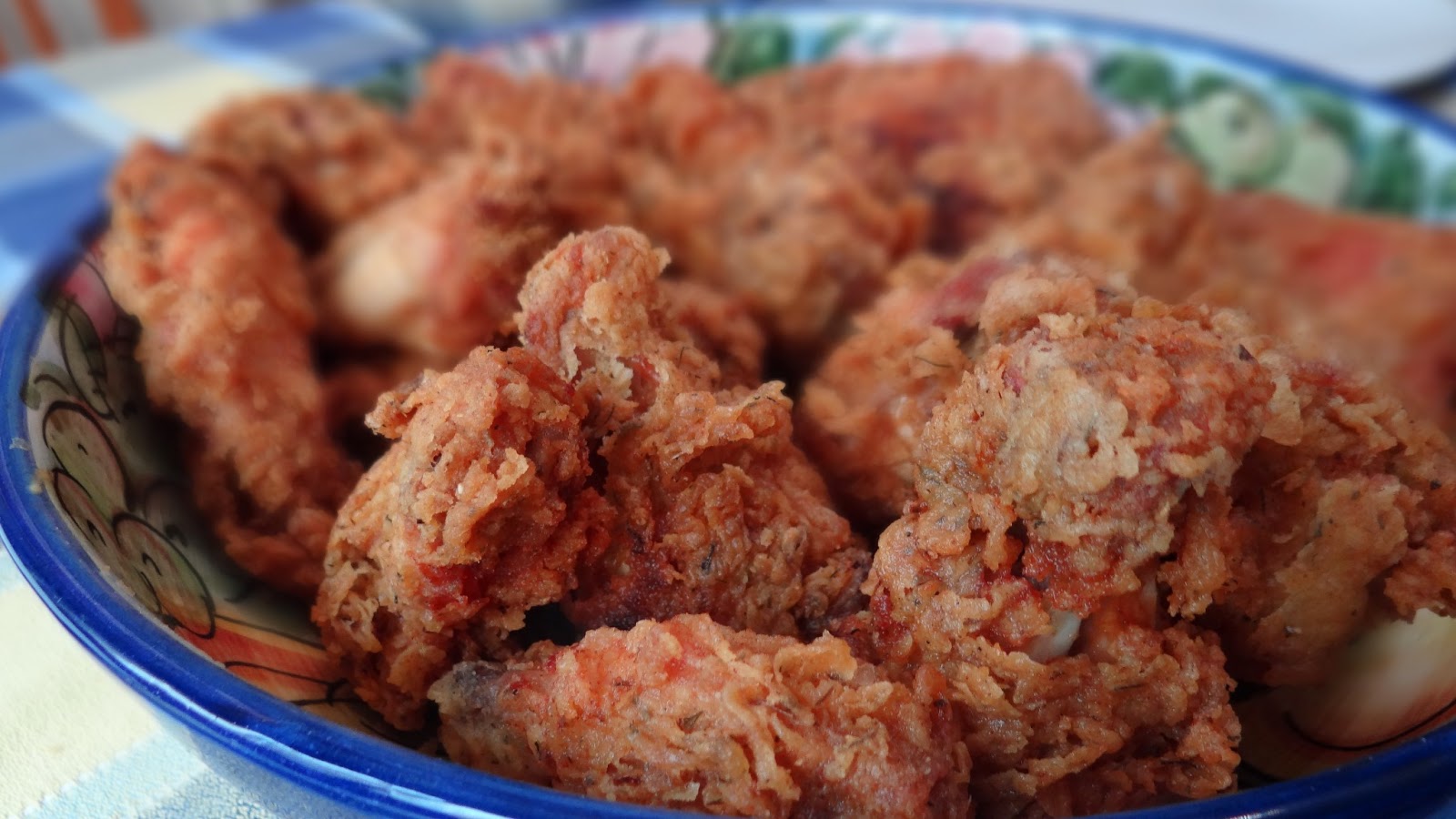 A continuación, sacamos los trozos de nuestro pollo frito estilo americano de la mezcla de la leche y los pasamos al bol con la harina. Damos unas vueltas para que queden bien impregnados, sacudimos para retirar el exceso de harina y freímos en una sartén con abundante aceite caliente.