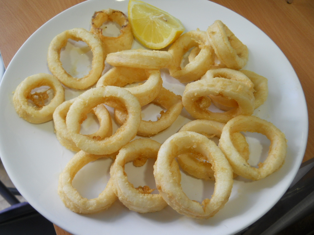 En un bowl se mezcla la harina, los huevos, el agua mineral, sal y pimienta. Sumergir los anillos y freír en aceite caliente (160°C).