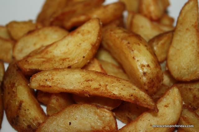Lavar bien las patatas, y cortar en gajos (sin pelarlas). Mezclar la harina con los demás ingredientes y remover las patatas en ésta mezcla.