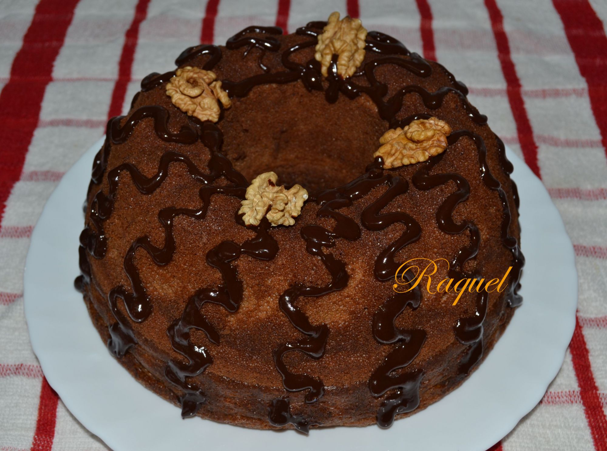 un bizcocho esponjoso con sabor a naranja, nueces con chocolate