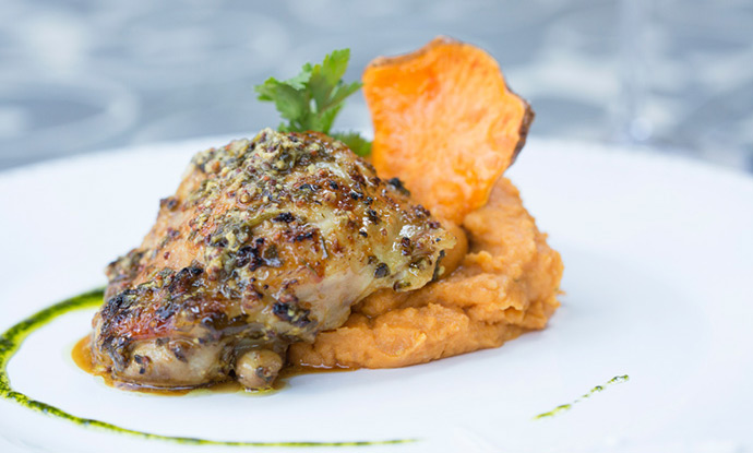 Cortar las pechugas de pollo, deshuesadas, por la mitad, para obtener unos filetes gruesos. Colocarlos sobre una hoja de papel de horno.