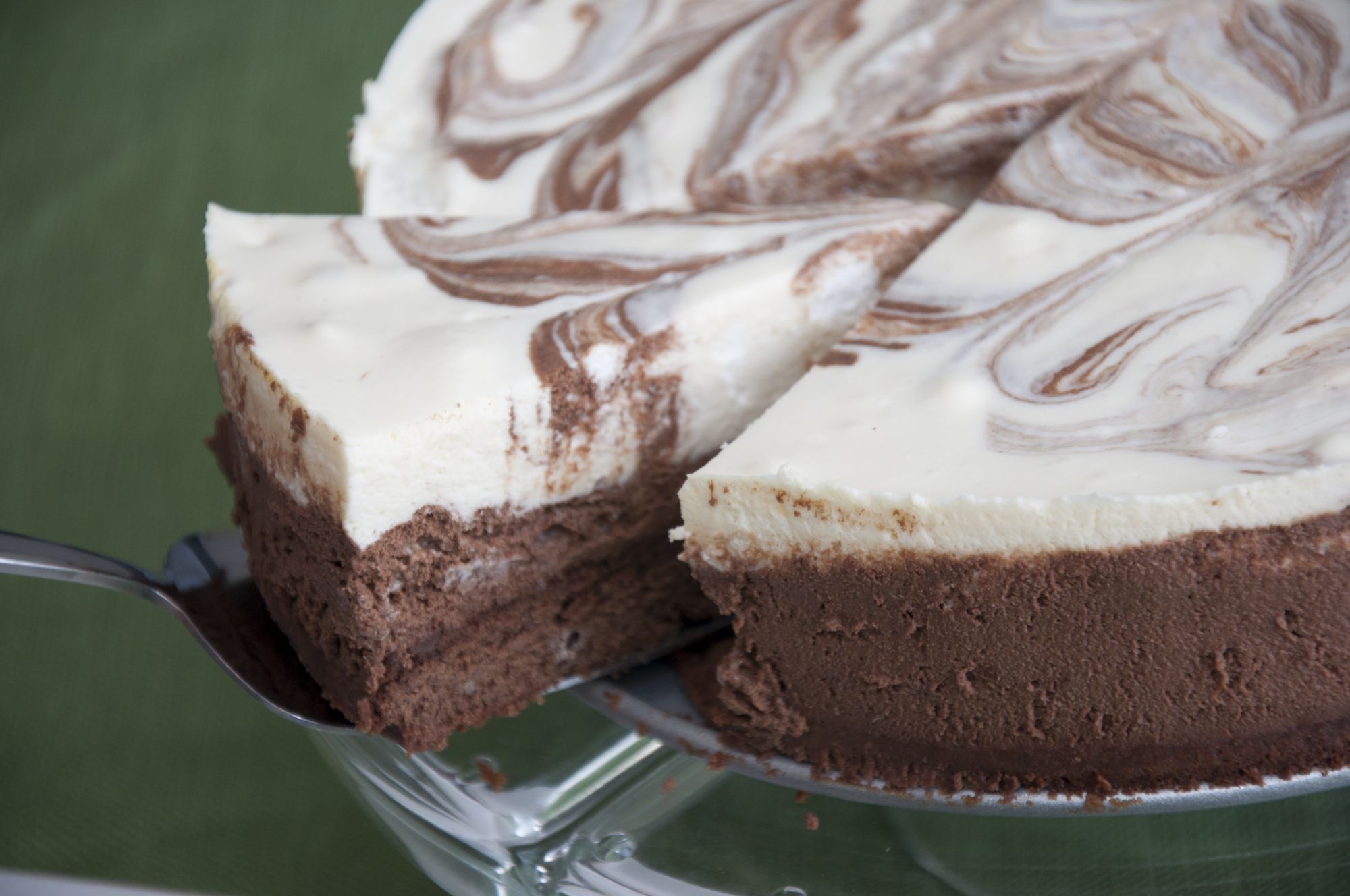 Una tarta de queso con 2 capas, una de vainilla y otra de chocolate.