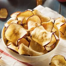 Echa con cuidado las rodajas de patata una vez que el aceite haya alcanzado la temperatura indicada y deja que se doren y que queden crujientes.