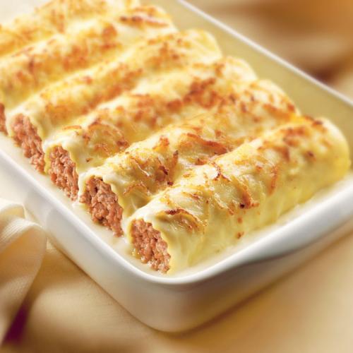 Colocamos los canelones en una bandeja para horno, previamente engrasada. Cubrmosr con la bechamel, colocamos por encima el queso parmesano y gratinamos hasta que queden dorados al gusto