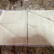 Una vez extendida la cortamos en 4 trozos y cada trozo en diagonal formando 2 triángulos de cada trozo. 8 triángulos en total por cada hojaldre.