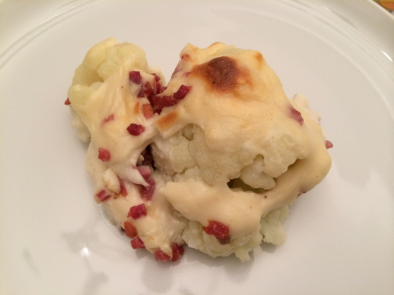 Ahora sólo queda montarlo todo en una fuente para pasarlo a gratinar: colocamos toda la coliflor partida en una fuente, le añadimos los taquitos de jamón y ajo, y por encima toda la bechamel, ahora podemos añadirle un poco de queso al gusto, gratinamos y listo!! A servir y disfrutar!