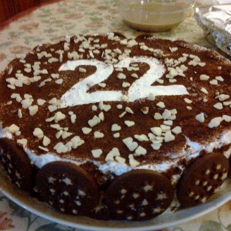 Decorar el lateral de la tarta con galletas de chocolate mojadas en café. Espolvorear con trocitos de chocolate blanco y cacao en polvo.