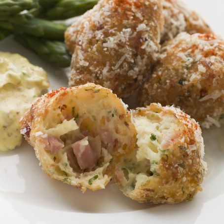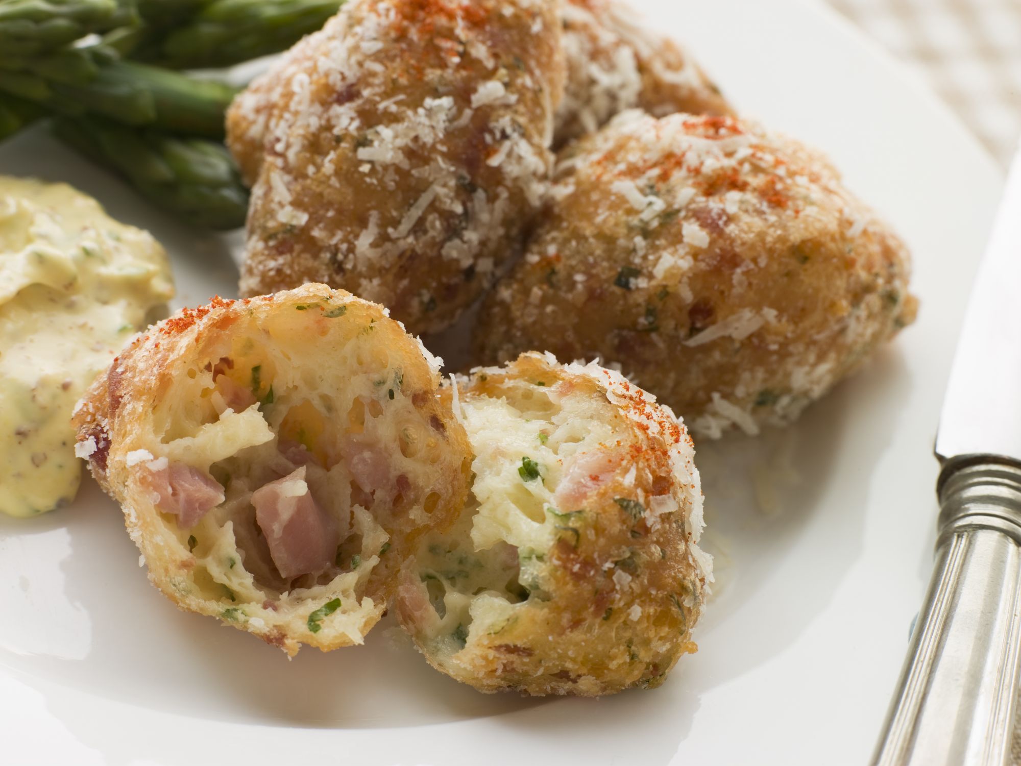 Cuando la masa nos quede bien homogénea, añade los dientes de ajo machacados, la cebolla cortada muy fina, el pimiento de espelette y un ramillete de cebollino. Mezcla bien, añade los daditos de jamón y el queso rallado. Salpimentar.