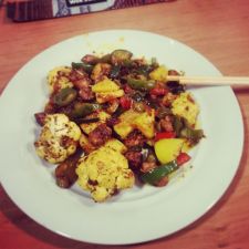En una cazuela echamos una cucharada de aceite de sésamo y a fuego alto echamos las verduras y el pollo con toda la mezcla en la que lo hemos marinado. Añade el azúcar. Remuece y salpimenta. Tápalo y deja que se haga durante 20 minutos. Remueve de vez en cuando y comprueba que el pollo esté bien hecho.