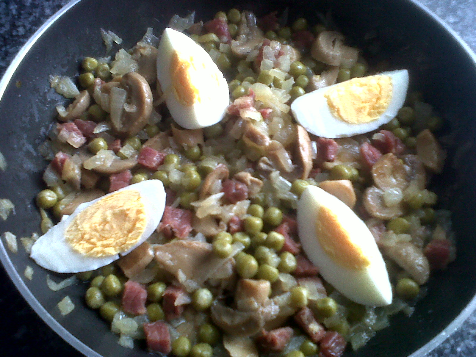 Añadir el jamón en tacos, un buen chorro de vino blanco y los guisantes. Dar unas vueltas y dejar que se cocinen 10 minutos. Si vemos que se secan añadir un poco del caldo de la cocción de los guisantes.
