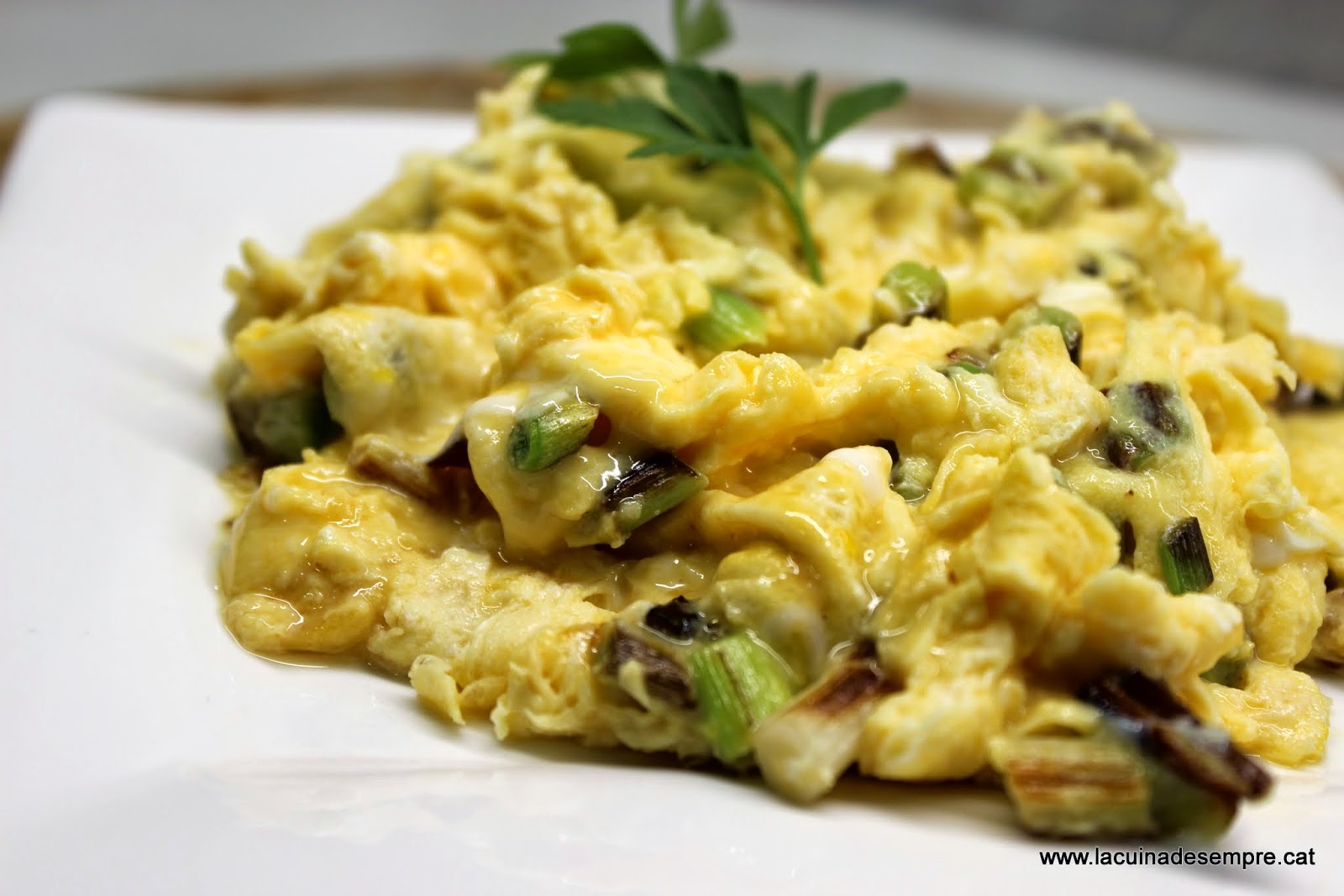 Abocar els ous i barrejar sense deixar de remenar. No esperar a que es faci del tot. A la vista l'ou ha de quedar lleugerament cru. La calor passiva o residual del conjunt li donarà la cocció que falta a l'ou.