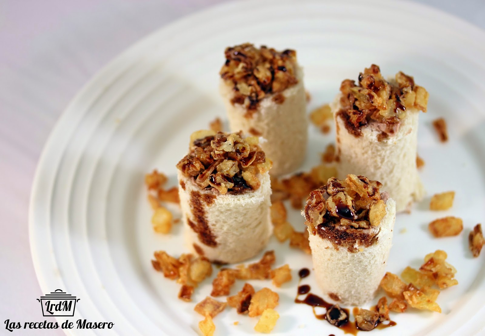 Quitamos la corteza al pan bimbo en caso de que la tenga con un cuchillo y pasamos un rodillo por encima de la rebanada para compactarla y evitar que se rompa al enrollarla. Untamos bien de foie gras, enrollamos y cortamos a la mitad. De cada rebanada te salen dos rollitos. Los colocamos en el plato, echamos la cebolla en la parte superior y lo regamos al gusto con la reducción de Módena o Pedro Ximénez.