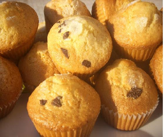 Por otro lado, se preparará una bandeja rígida de magdalenas, se le colocarán papelillos en el interior de cada hueco y se irán rellenando con la mezcla (en caso de que se quiera echar un poco de chocolate picado se echa un poco de masa , encima el chocolate y se acaba con más masa). Es interesante llenar 2/3 de papelillo o algo más para que queden con un bonito copete. Espolvorear un poco de azúcar encima de cada magdalena.
