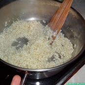 Ponemos en una cacerola con aceite a fuego medio a pochar la cebolla. Cuando esta comience a dorarse, echaremos el arroz y lo removeremos, de forma que se cocine un poco el arroz y suelte el almidón.