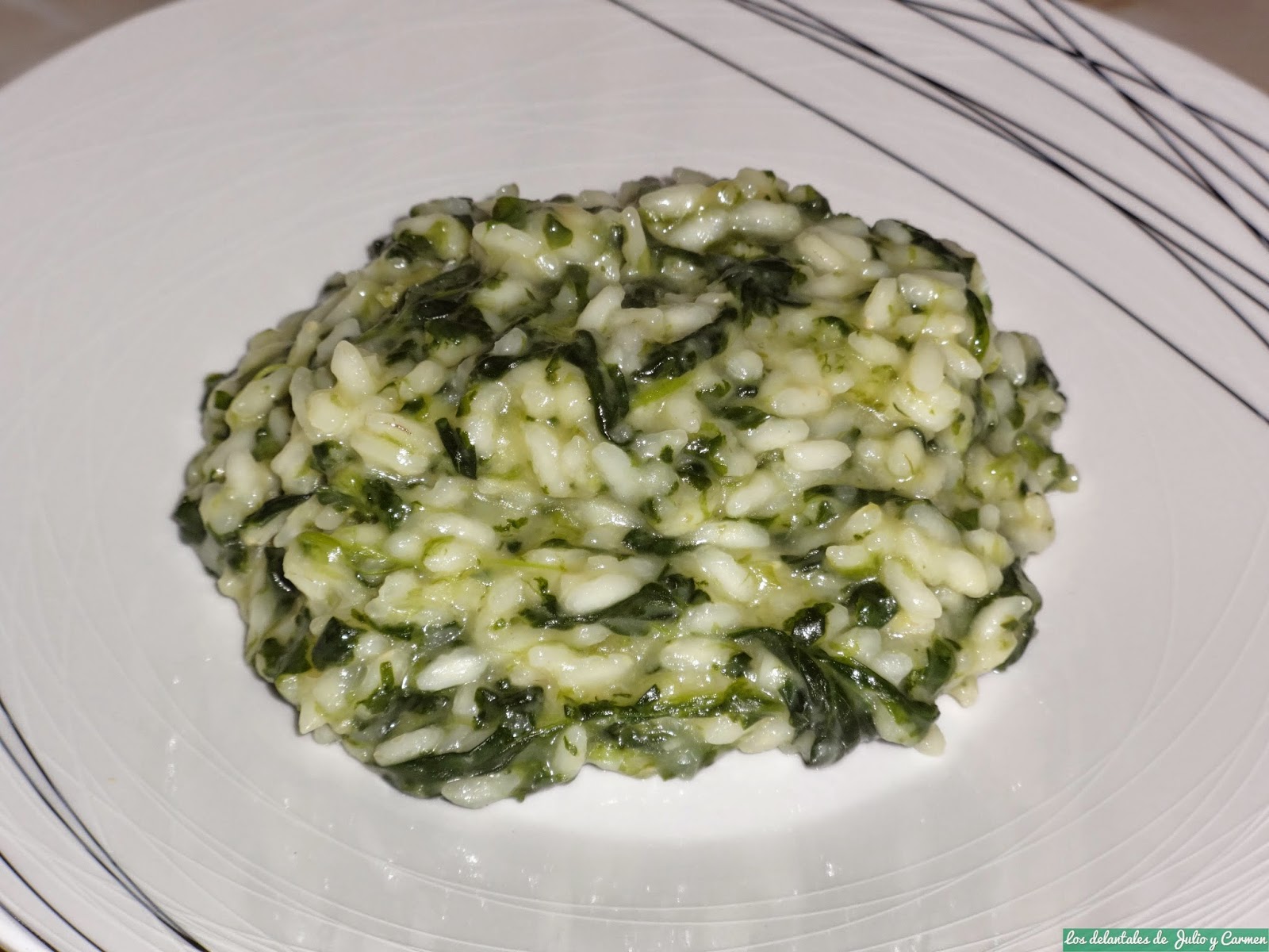 Cuando apenas nos quede caldo para echar, verteremos las espinacas y lo removeremos de forma que se distribuyan bien por todo el arroz.
