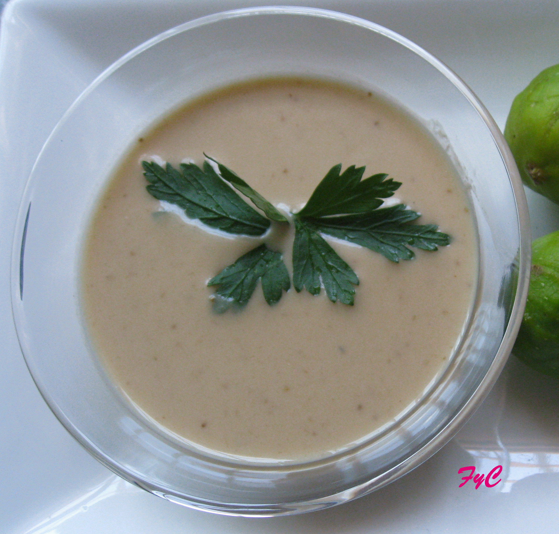 Poner aceite que cubra el fondo de una olla y rehogar la cebolla, el puerro y la patata. Antes de que cojan color agregar los higos pelados y dar unas vueltas a todo el conjunto. Añadir el caldo y dejarlo cocer durante 20 minutos a fuego suave. Pasarlo por la batidora y luego por el chino para que nos quede una crema fina.