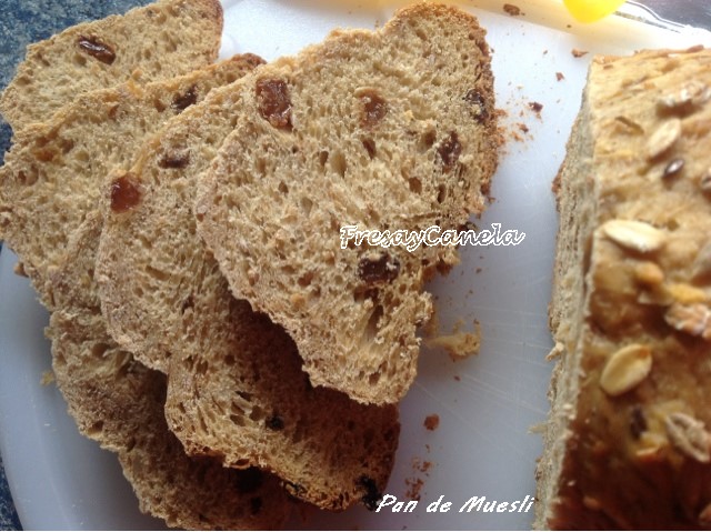Cuando vaya a empezar el horneado paramos un momento la panificadora, pincelamos el pan con leche y espolvoreamos un poco de muesli por encima. Volvemos a encender y dejamos hasta que termine el programa.