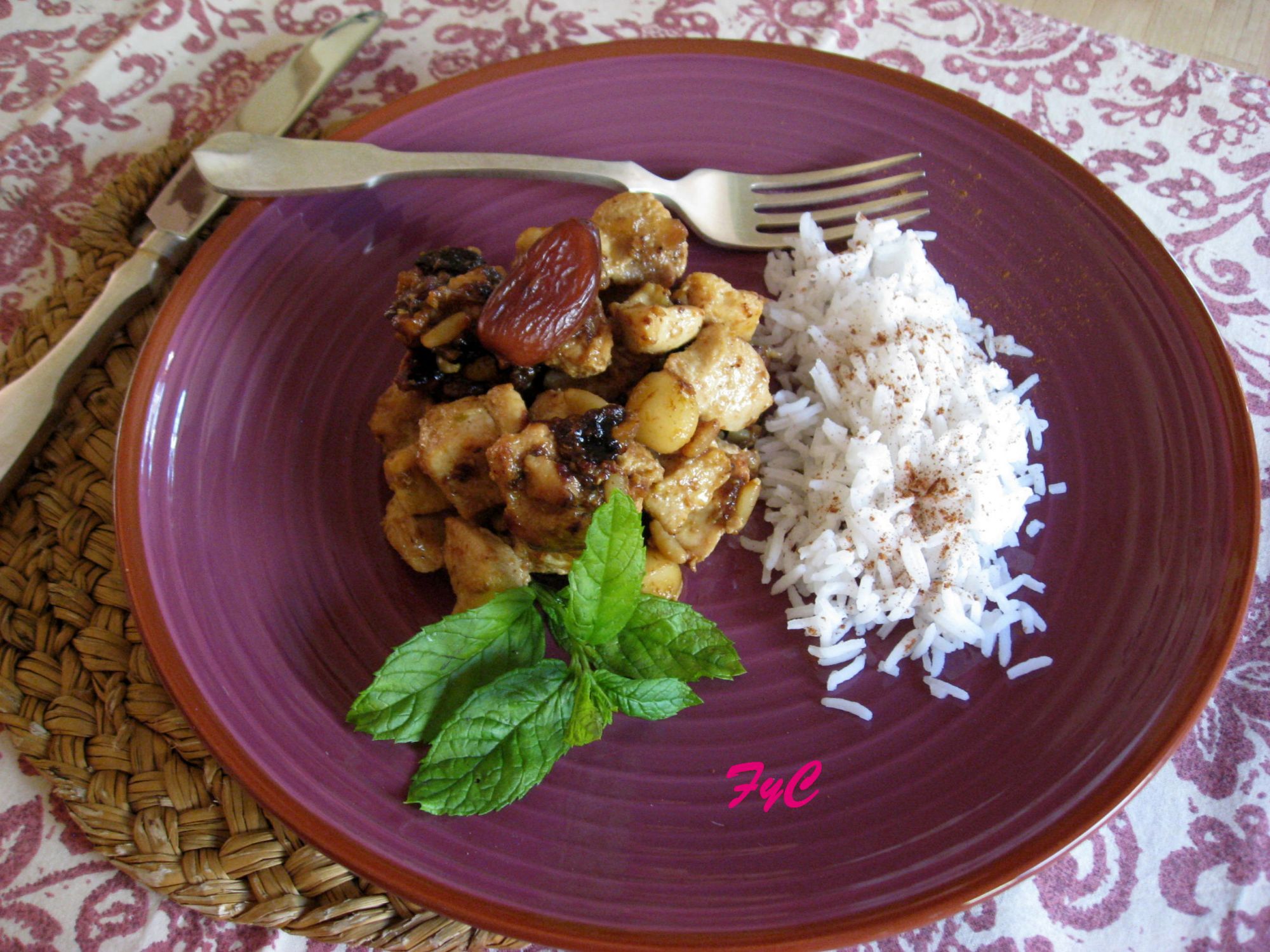 Cuando la carne va tomando un poco de color echamos las pasas, las almendras, los dátiles, la ralladura de limón y las especias. Dejamos rehogar todo bien hasta que el pollo termina de tomar color. Añadimos el vino y lo dejamos reducir.