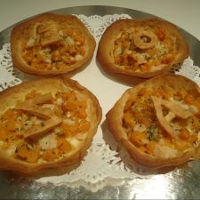 Verter sobre cada tartaleta una buena cucharada de tomate triturado y añadir las especias