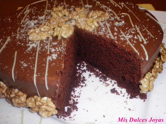 Y por ultimo una vez fría la cobertura decorar con chocolate blanco fundido (yo también con nueces, lo mejor seria poner unas almendras fileteadas ya que la receta lleva almendras molidas, pero bueno yo le he puesto nueces es lo que tenia por casa, si tenéis almendras enteras o fileteadas mejor).
