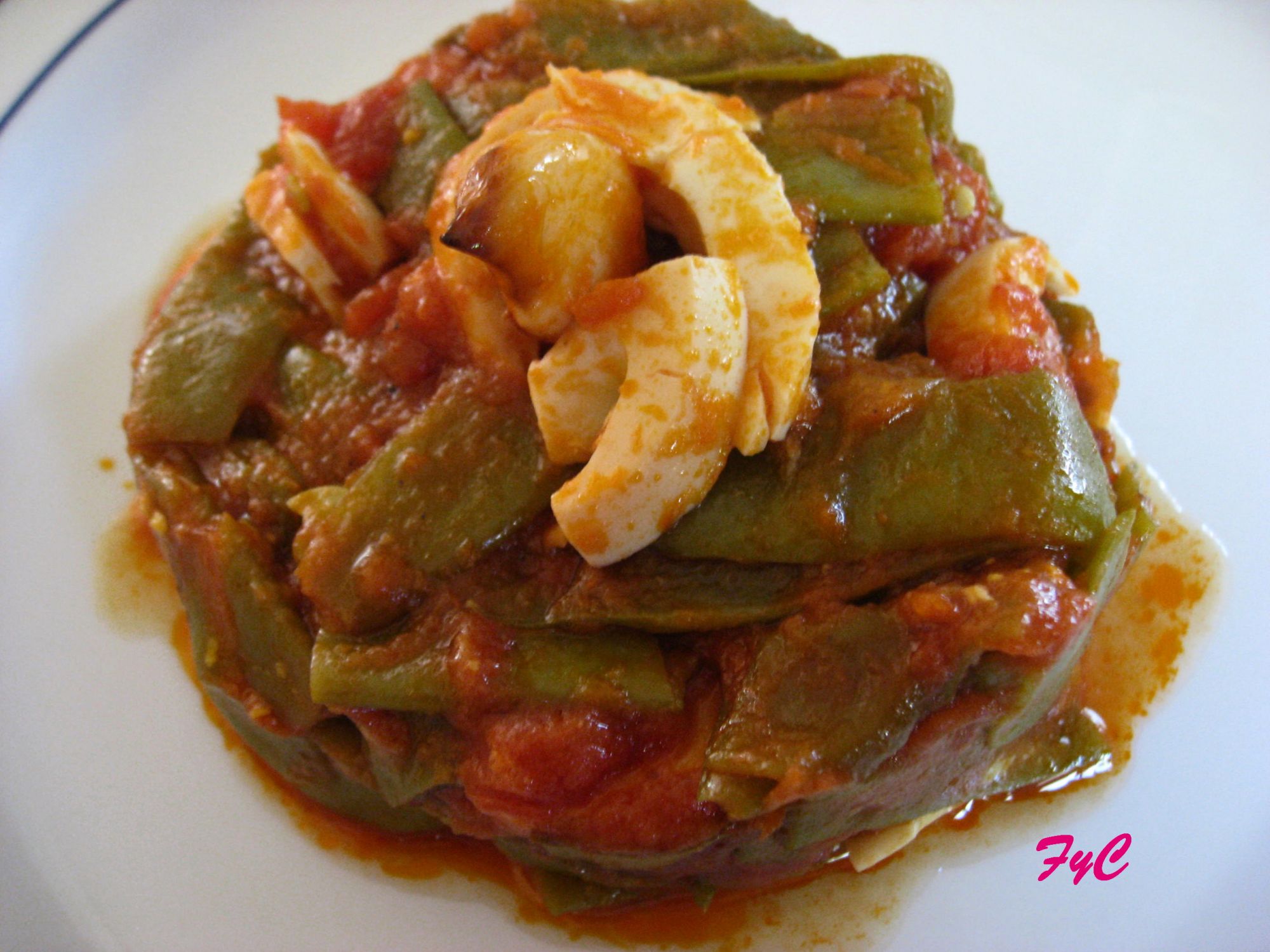 Quitar la hebra a las judías, lavar y cortar del tamaño que os guste. Yo suelo cocerlas al vapor pero podéis hacerlo en agua, eso como más apetezca. Las dejamos un poco "al dente" pensad que luego las dejaremos un poquito con el tomate y terminaran de hacerse.
