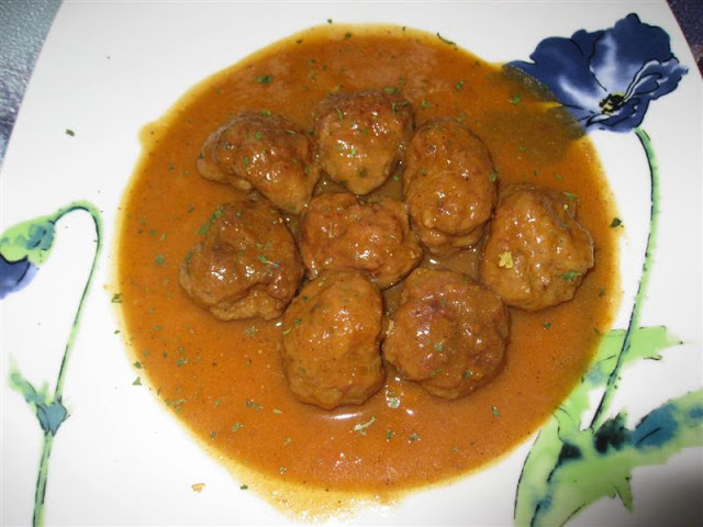 Con la olla abierta y el aceite que nos ha sobrado (si hace falta ponemos un poco mas) y en el mismo menú pochamos las verduritas. Cuando estén añadimos la harina y sofreír unos segundos, agregar la cerveza, el curry, la pastilla de avecrem, el agua y las albóndigas. Tapamos la olla y en menú carne 10 minutos, despresurizar y pasar la salsa si no queremos encontrar tropezones.
