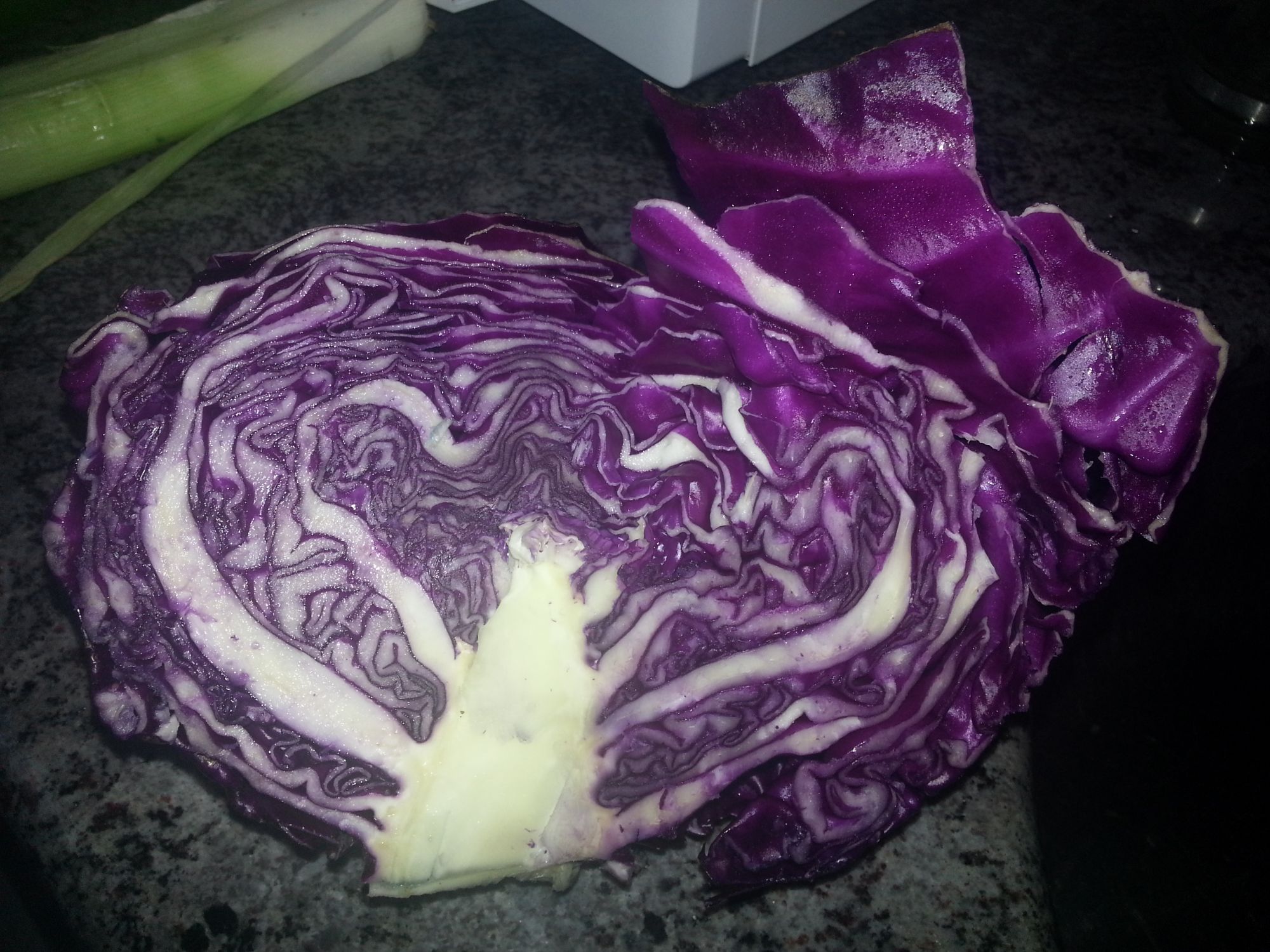 Quitar las hojas en mal estado. Coger el cuchillo y partirla por la mitad. Quitar el tronco y partir en trozos. Cada trozo hacer juliana con él (partirlo muy fino) e ir echándolo en un tupper.